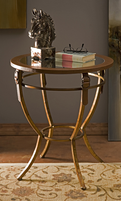 Mary Mayo’s Macrae mirror-top side table carries broad appeal that will fit almost any motif. Standing at just over 2′ tall, this occasional table features a circular mirror set inside a faux leather-covered top, faux leather buckled straps and an iron base.